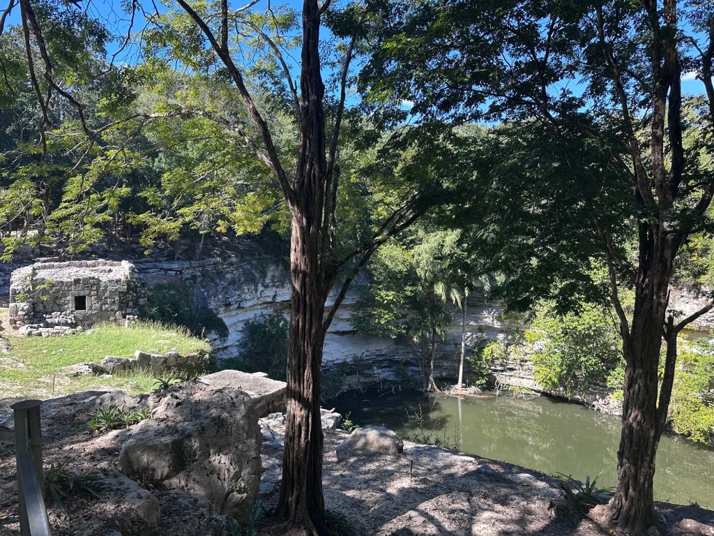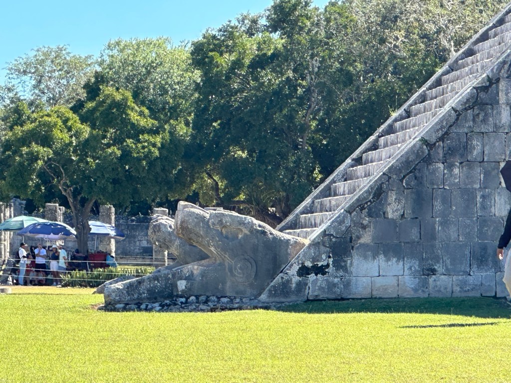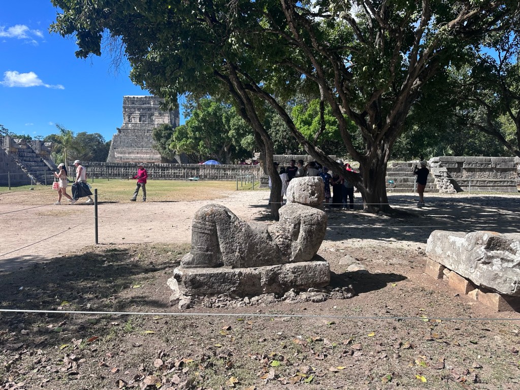 The Mayans revered multiple gods that correspond to aspects of nature. You can see heads of the feathered serpent god are at the base. Religious rituals and sacrifices were an integral part of Mayan culture. The city served as a hub for ceremonial practices, including offerings to appease the gods and ensure the well-being of the community. Human sacrifices were carried out during significant events, believed to strengthen the connection between the earthly realm and the divine. These rituals often took place at the Cenote Sagrado. This is a natural sinkhole.