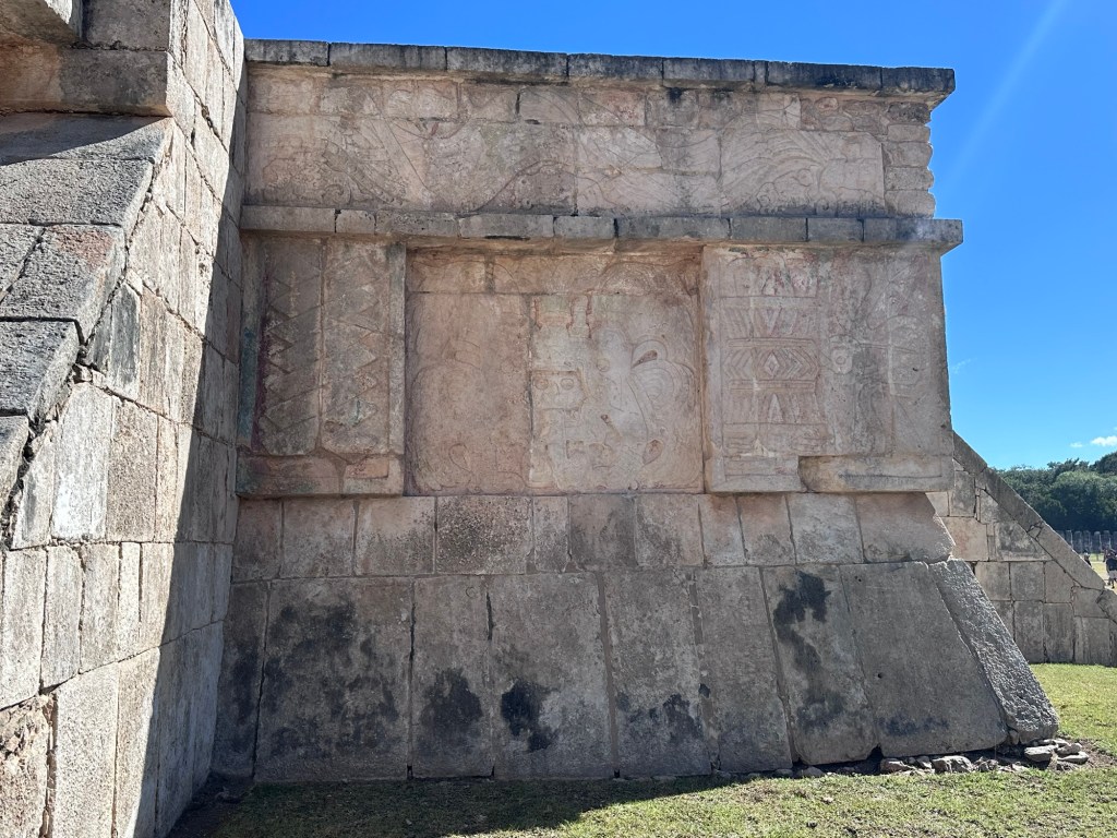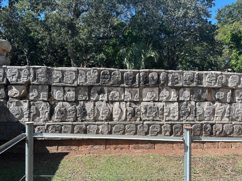 These are carvings of skulls of the warriors who won the fighting game. The loser stays alive. It was an honor to be sacrificed to the gods. They also displayed the heads of the sacrificed on this wall.