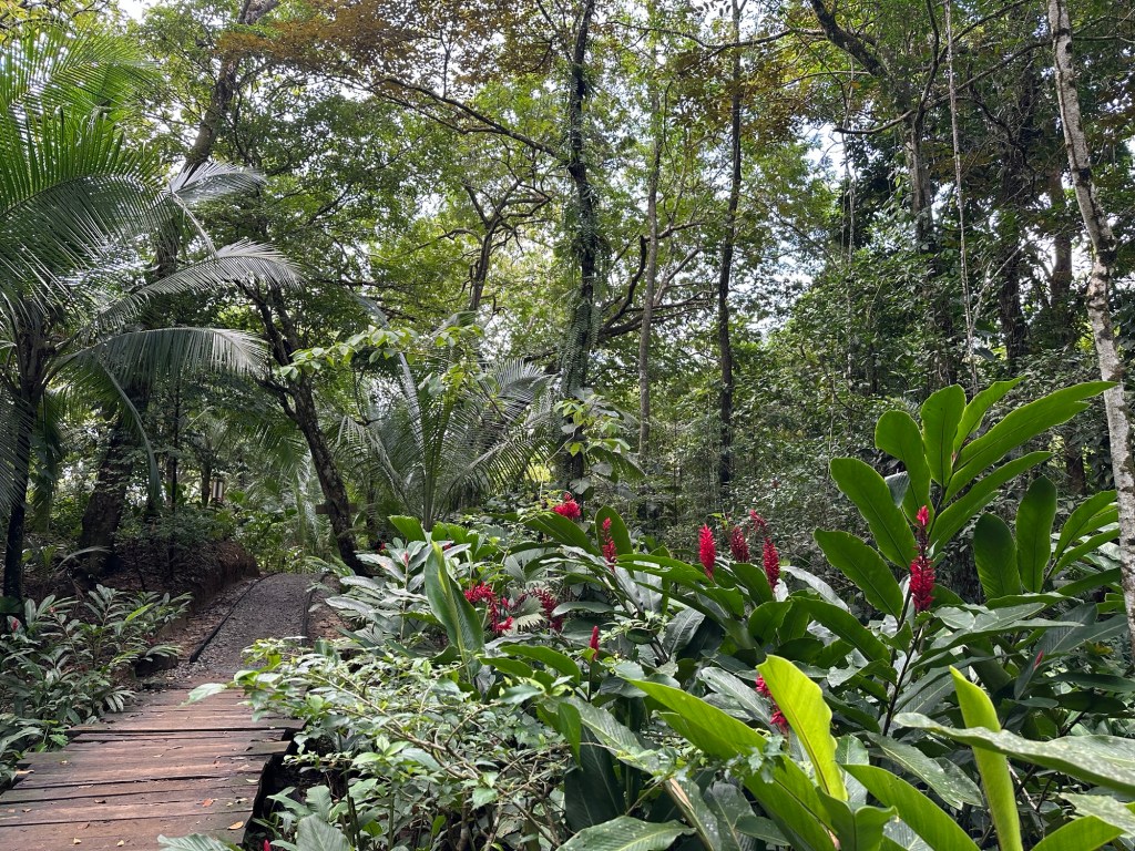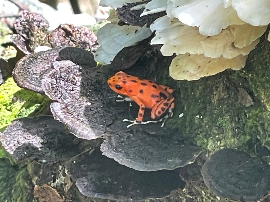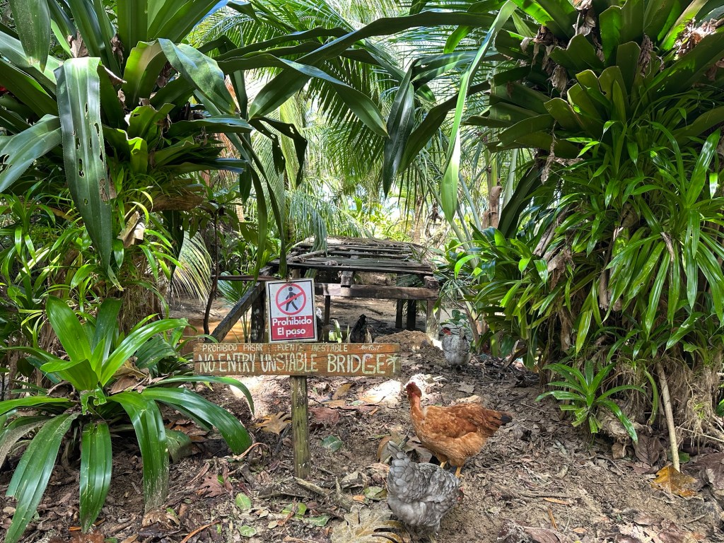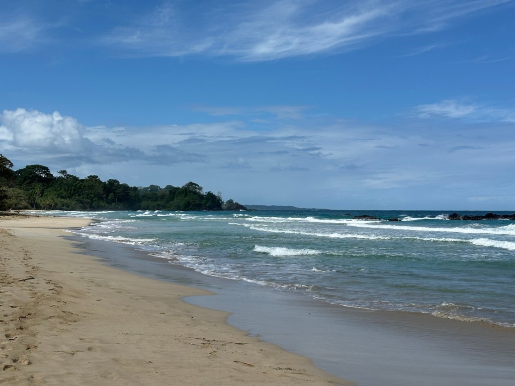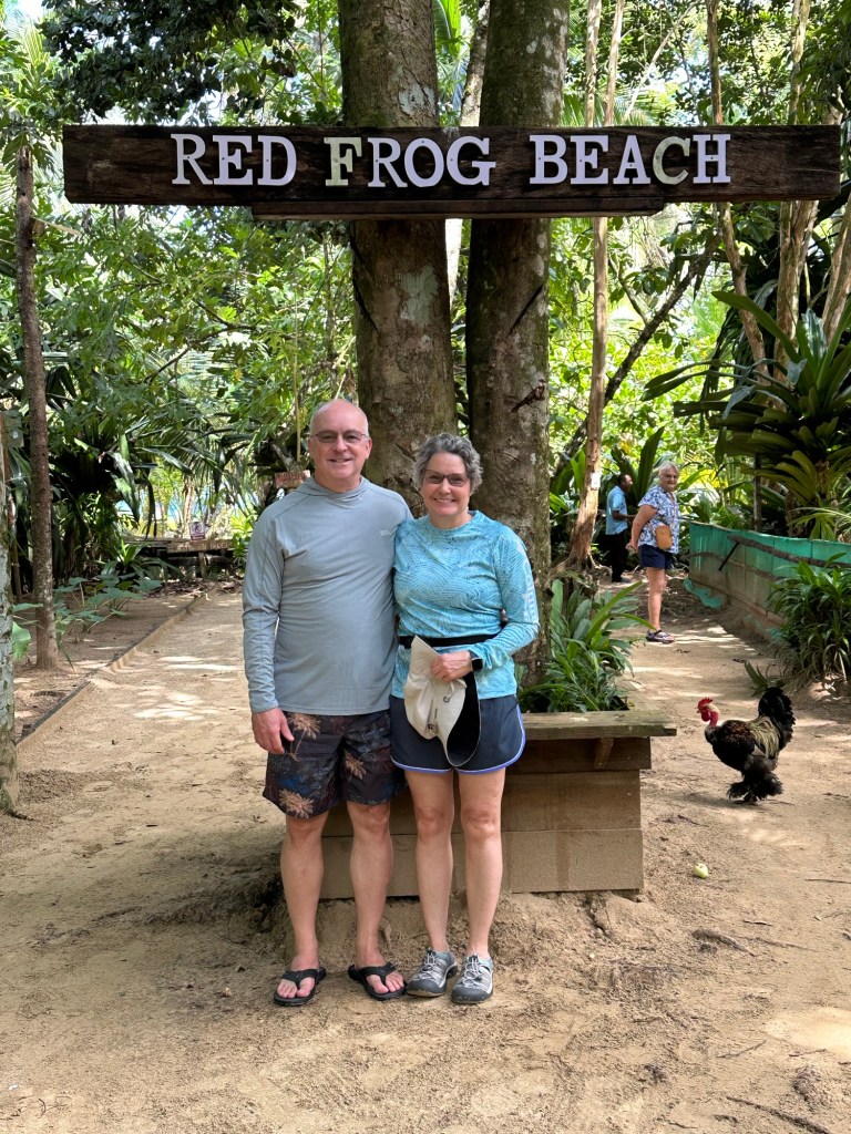 Bocas Del Toro is a province of Panama. Its area is 4,643.9 square kilometers, comprising the mainland and nine main islands. The population was near 160,000 in 2023. The port area was small, clean, with open air restaurants and bars lining the street. There were also stands offering tours. We were walking along when we came to some fellow cruise passengers inquiring about a tour to Red Frog beach. They graciously allowed us to join and even loaned us some cash. (One thing we’ve gotten wrong so far is the prices we saw online.) The $10 water taxi was one way per person. And nobody wants to take a credit card. Cash is still king here. The tour was $25 per person plus the $5 per person fee to walk the shortcut jungle path to Red Frog beach.