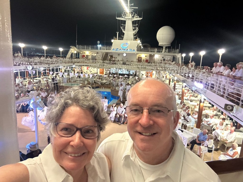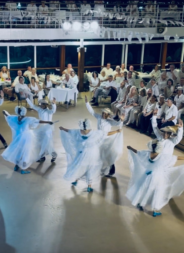 Azamara has a featured “white night” on each segment. White tablecloths cover tables placed on the pool deck. There is a buffet of grilled meats, salads, appetizers, vegetables, and of course desserts! We had live music and a special presentation from a local cultural band and dance group.