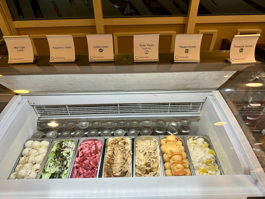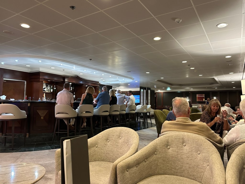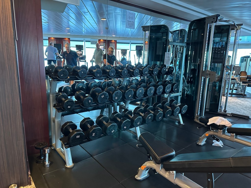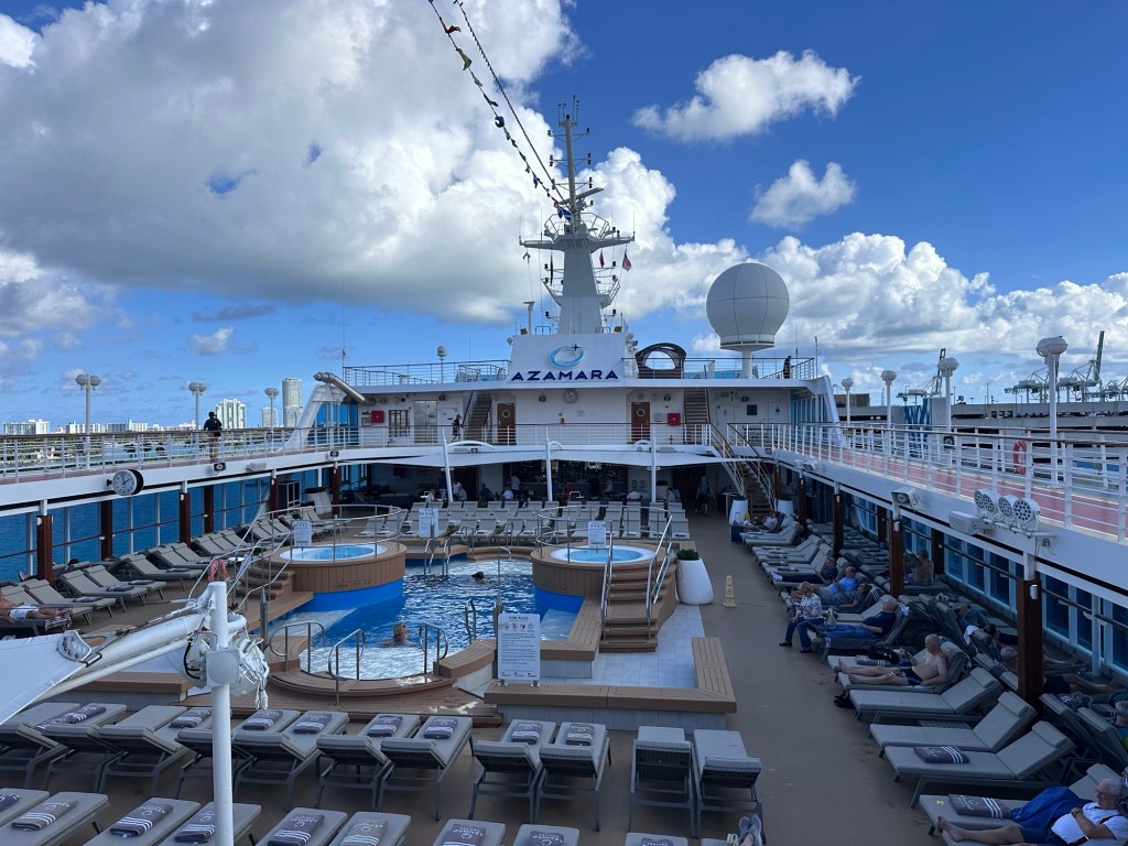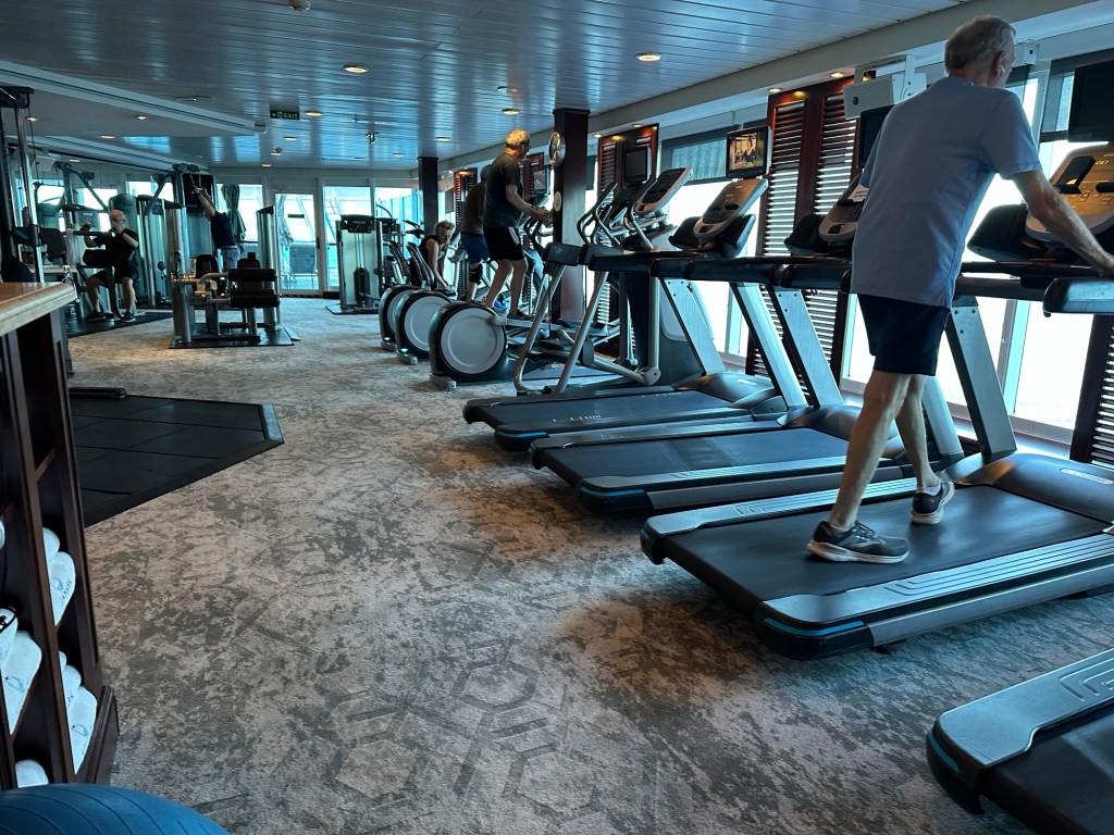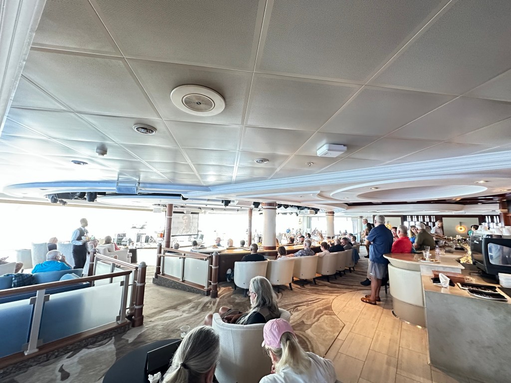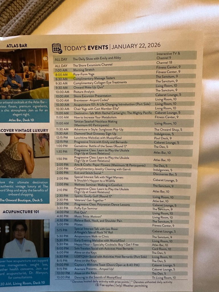 An example itinerary for the day. Joe and David have now gotten permission to have space for Bible study on sea days at 8:30 am. That will be added to the schedule. The pool deck with 2 hot tubs, pool bar, patio grill, and the live band periodically. Pool lounge chairs located in ☀️ sun or shade. Captains versus guests cornhole. We asked who is guiding the ship and they said they put a stick in the steering wheel. The captains are very funny. I found a quiet place in the living room to do some reading. One area is a library for reading and the other side has tables for puzzles and card games. The middle of the living room has a stage, bar, and is used for trivia. This is the living room today when they streamed the NFL playoff games. We had so much food! The cabaret room where lectures and shows take place. The den is a busy place where the bar opens at 5:00pm and people hang out before and after dinner. This is where we met up with friends before dinner. Often there is a pianists or soloist at 8:00pm.Each 2 week segment includes an Azamazing event for the whole ship, usually on shore at a special event center. Azamazing evening entertainment by locals playing on handmade instruments in Quayquil, Ecuador. Exclusive rum tasting for World cruisers in the Atlas Bar. We also had a pisco sour tasting with several types of brandy. Dinner with the cruise director, Emily and world cruise director, Abby. This was our turn as World Cruisers to eat dinner with Captain Alex and the hotel administrator, Tomasz. I asked him what a hotel administrator does and he said he is in charge of everything except the navigation of the ship! The ship is a floating hotel.Salad in the Discoveries restaurant Fancy dinners in the Discoveries restaurant Gelato is offered everyday in the buffet as well as the restaurant. This is frozen yogurt. Gelato in the buffet area We go to the gym on sea days. We do a lot of walking on excursion days.This is what I wanted to know before I came. Yes! They do have plenty of light weights as well as the larger ones. Classes are offered often in the morning. It varies from stretching, yoga, abs, Pilates, etc. I’m trying them all to see if any of them would be helpful. I had read someone recommended bringing your own yoga mat. I totally understand now. I may buy one when we get to Australia. The mats are very worn and difficult to clean. Updates are coming next year, so surely yoga mats are on the list. This picture shows spinner bikes. I think spinner bikes are outdated and should be replaced by modern exercise bikes. They only have one of the modern exercise bikes and there’s always a wait for it.