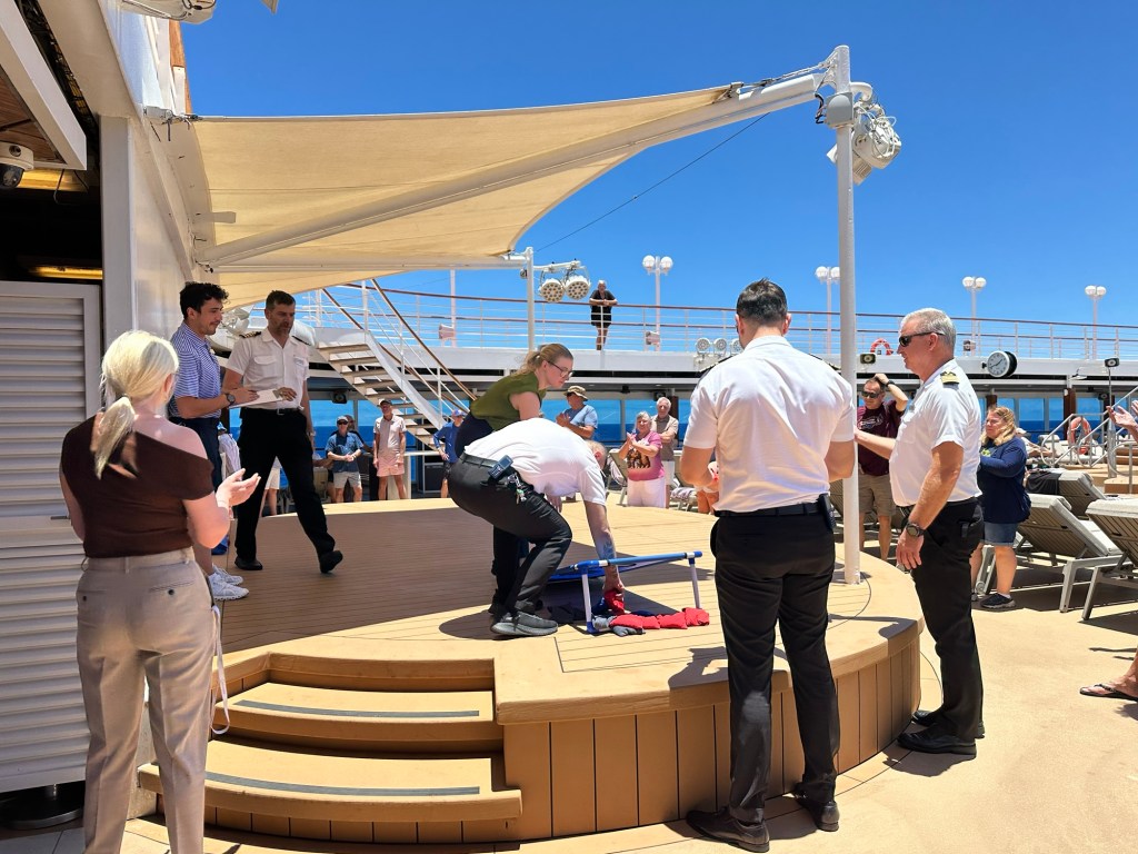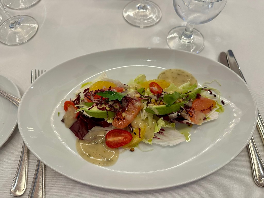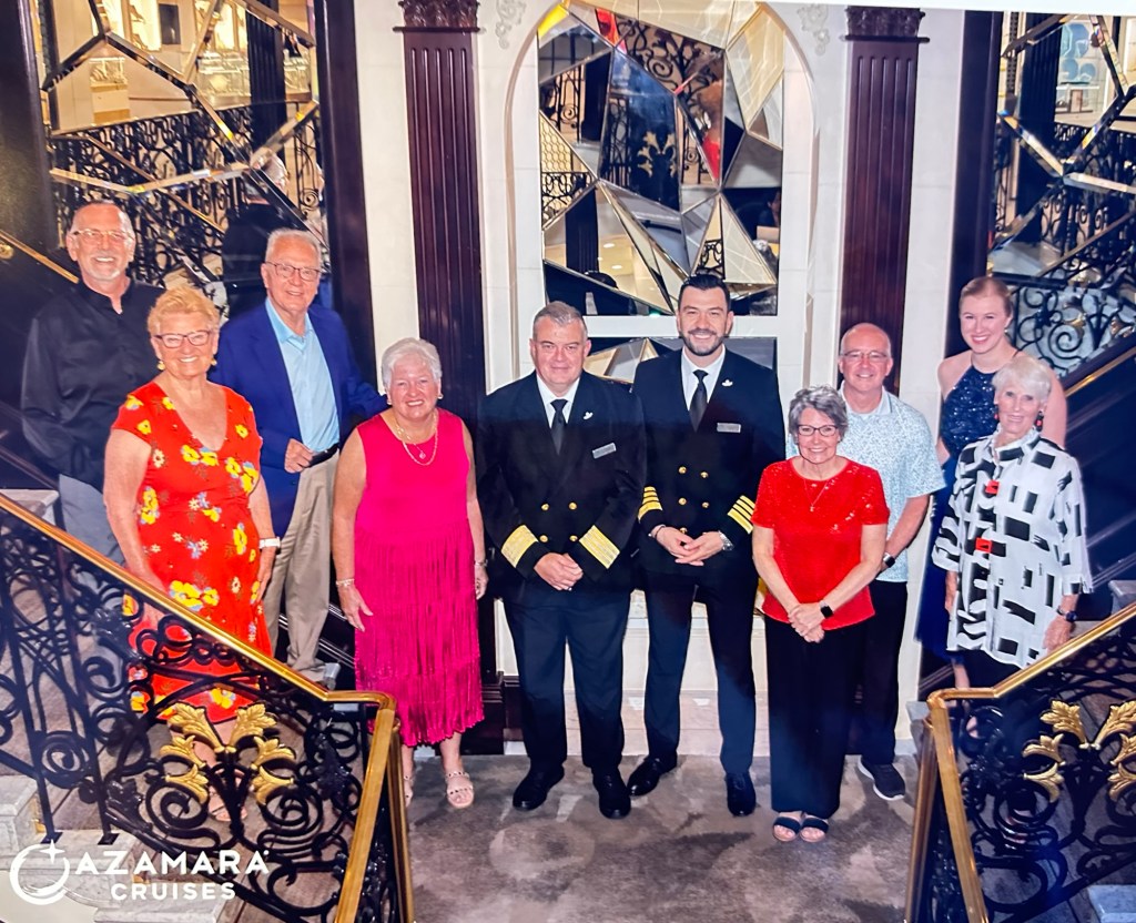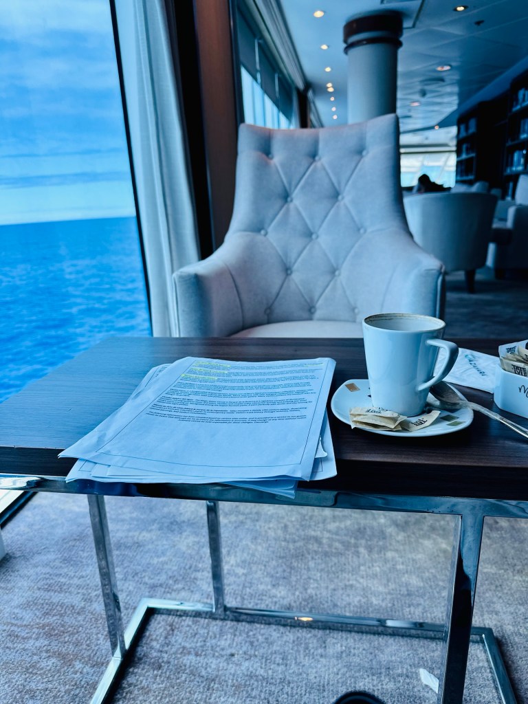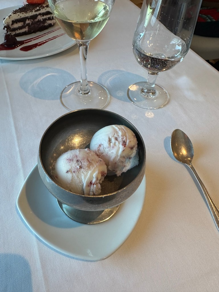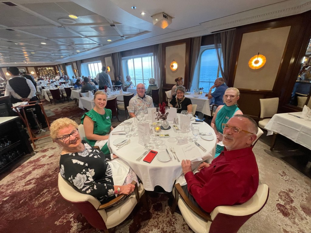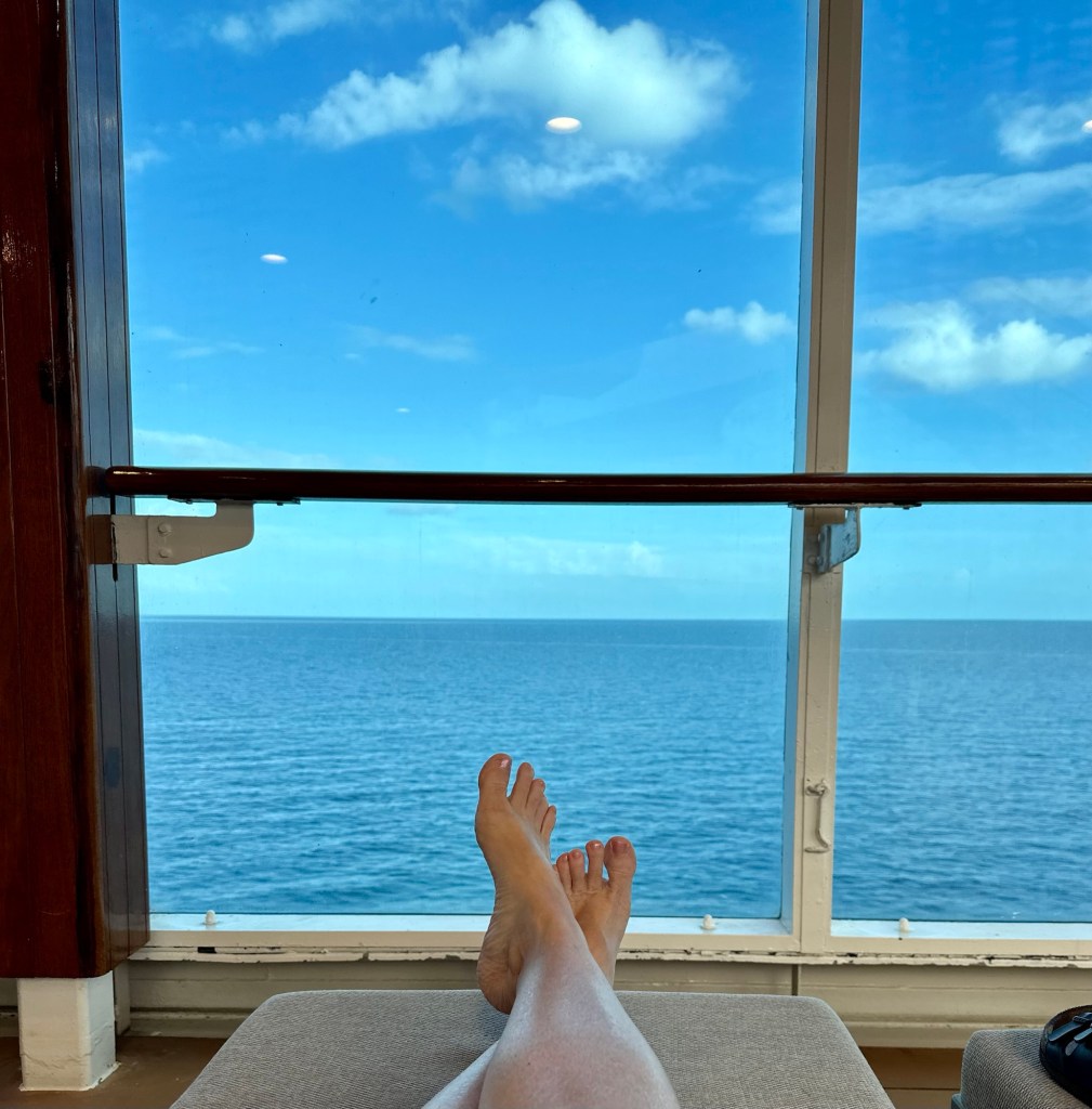 An example itinerary for the day. Joe and David have now gotten permission to have space for Bible study on sea days at 8:30 am. That will be added to the schedule. The pool deck with 2 hot tubs, pool bar, patio grill, and the live band periodically. Pool lounge chairs located in ☀️ sun or shade. Captains versus guests cornhole. We asked who is guiding the ship and they said they put a stick in the steering wheel. The captains are very funny. I found a quiet place in the living room to do some reading. One area is a library for reading and the other side has tables for puzzles and card games. The middle of the living room has a stage, bar, and is used for trivia. This is the living room today when they streamed the NFL playoff games. We had so much food! The cabaret room where lectures and shows take place. The den is a busy place where the bar opens at 5:00pm and people hang out before and after dinner. This is where we met up with friends before dinner. Often there is a pianists or soloist at 8:00pm.Each 2 week segment includes an Azamazing event for the whole ship, usually on shore at a special event center. Azamazing evening entertainment by locals playing on handmade instruments in Quayquil, Ecuador. Exclusive rum tasting for World cruisers in the Atlas Bar. We also had a pisco sour tasting with several types of brandy. Dinner with the cruise director, Emily and world cruise director, Abby. This was our turn as World Cruisers to eat dinner with Captain Alex and the hotel administrator, Tomasz. I asked him what a hotel administrator does and he said he is in charge of everything except the navigation of the ship! The ship is a floating hotel.Salad in the Discoveries restaurant Fancy dinners in the Discoveries restaurant Gelato is offered everyday in the buffet as well as the restaurant. This is frozen yogurt. Gelato in the buffet area We go to the gym on sea days. We do a lot of walking on excursion days.This is what I wanted to know before I came. Yes! They do have plenty of light weights as well as the larger ones. Classes are offered often in the morning. It varies from stretching, yoga, abs, Pilates, etc. I’m trying them all to see if any of them would be helpful. I had read someone recommended bringing your own yoga mat. I totally understand now. I may buy one when we get to Australia. The mats are very worn and difficult to clean. Updates are coming next year, so surely yoga mats are on the list. This picture shows spinner bikes. I think spinner bikes are outdated and should be replaced by modern exercise bikes. They only have one of the modern exercise bikes and there’s always a wait for it.